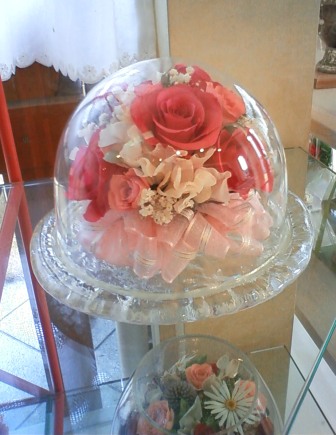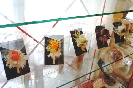 ボトルブーケや3D加工、押し花加工のサンプルもたくさん展示されています。