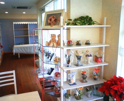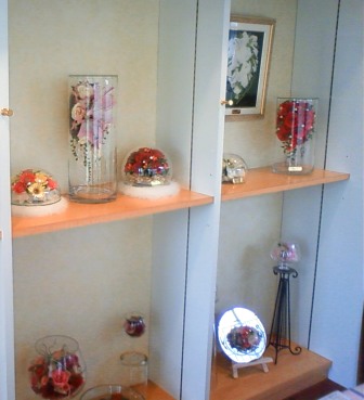 壁にそって作られた一面の棚には、ボトルブーケをはじめギフトにもなるフラワーアレンジ、プリザーブドブーケなどが並んでいます。