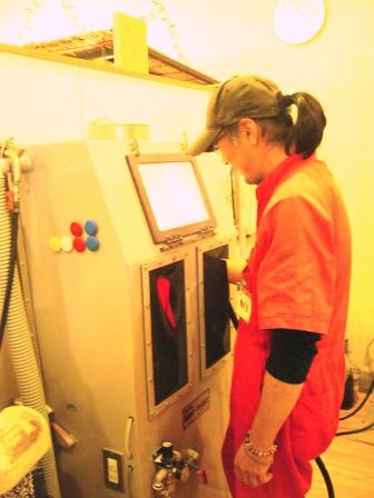 向かい合っているマシンがご自慢のエッチングブラスター。サンドブラスト技法(硬く細かな砂を高圧エアで吹き付けてガラスを削る)を駆使して世界にひとつだけの作品を仕上げていくんです。