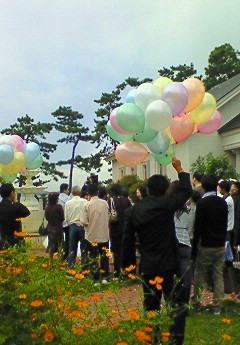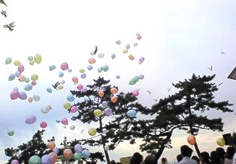 出た!ピジョン&バルーンのダブルリリース。ジェット風船はありませんがかなり迫力の演出です。ポーポポポポポ・ポッポたちはセレモニーの後、ちゃんと自分の家にたどり着くそうです。そのあたりはアタシより賢いかもしれません… 聞く所によると香川県から飛ばしても帰って来るそうです。偉いなぁ。
