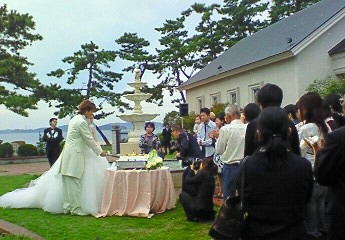 館外型チャペル「Sea Veil」で模擬人前式。海が見える大きな窓から明るい陽射し。今回のテーマは「Civil Mermaid Ceremony - 恋する人魚姫 -」。入場時に海の中をイメージさせるシャボン玉やスモークで幻想的な雰囲気に包まれたのでした。その画像をどーいう訳か消去してしまいました。ほんとすびばせん。