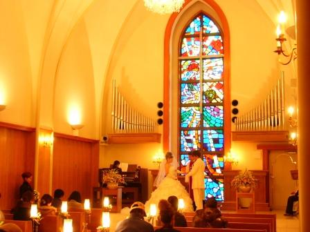 パイプオルガン、フルートの生演奏と声楽で心温まる挙式イメージでした。天井高が十分ありステンドグラスも圧巻です。