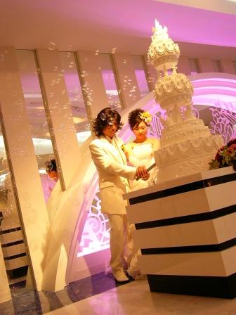 模擬披露宴ではキャンドルサービス、ケーキ入刀の演出。入刀の瞬間、シャボン玉が出たッ ぱッ